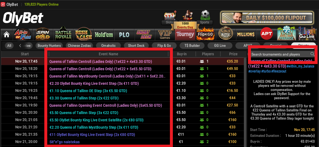 4. Samm: Otsi soovitud turniir ilmunud nimekirjast või sisesta turniiri nimi otsinguribale.